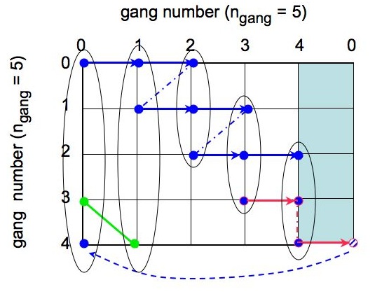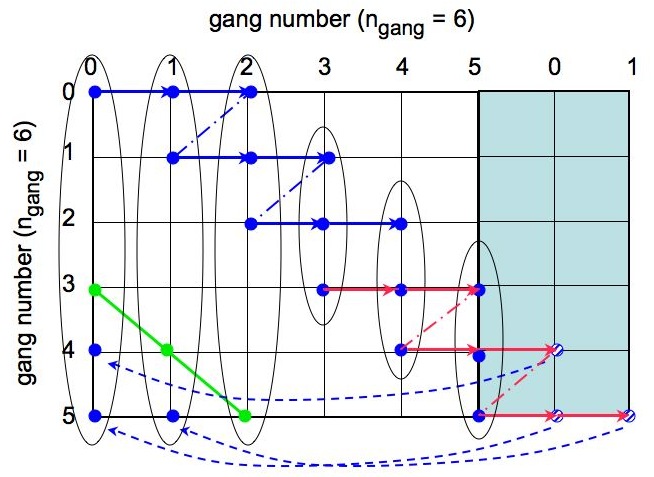 We note that for a communication instance, ic, the gangs with numbers, igang, such that (igang - ic+n_gangs)%n_gangs < (n_gangs+1)/2 participate always in the first (marked in blue in Fig. 2) MPI_Bcast while all the others - in the second call (red) with an exception of the last broadcasts, when for the odd number of gangs the second call does not happen. This provides an easy way to separate all the gangs into two groups each communicating only internally. Consequently, there is always n_gangs broadcasts performed by the code for each of the nmaps maps. These are arranged in (n_gangs+1)/2 communication instances. We also note that broadcasting gangs are always the ones for which either, igang = ic or igang = ic + (n_gangs+1)/2. On the MPI_Send/Recv stage the sending gangs are the ones for which igang > (n_gangs+1)/2 and respective receiving ones are the one with number jgang jgang = igang - (n_gangs+1)/2. We note therefore that all the gangs with igang < (n_gangs+1)/2 receive the data then, and that igang = (n_gangs+1)/2 does that only if n_gangs is even. Otherwise it remains idle. Alltogehter there is n_gangs/2 MPI_Send/Recv process for each of nmaps alm sets. The direction of MPI_Send/Recv can be clearly inverted with no change in what spectra are at the end computed, however the one proposed here leads to a better (or in fact as good as only possible) output data balance and it is therefore preferred here. After each instance of the communication, each gang which received new set of alms computes its (cross)spectrum with the data set(s) stored permanently in its memory. The (cross) spectra are computed using the S2HAT routine compute_xls. Once the spectra are calculated the temporary memory needed to accomodate the received spectra is reused for the next data set, while the spectra are preserved in the memory of the gang_root processor of each gangs. In this way the extra memory needed by each gang is equal to that needed to store one extra data sets plus whatever it is needed to store all the calculated spectra. The ordered in which the spectra are calculated and stored is illustrated in Fig. 3 below. The figure also shows how the spectra are assigned to the gangs, which compute and store them.