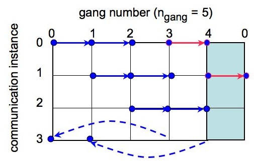 (See Section on Communication patterns for more explanations.) The vector xcl is organized in a way that nxtype spectra for each pair of maps are concatenated together and are followed by the spectra for another pair. The pairs of the maps for each part of the xcl vector are identified by the data sets global id numbers stored in the frstSpec and scndSpec. (nxspec*nmaps^2-((nmaps-1)*nmaps)/2), which store the global numbers of the data sets (first and second of the pair) used for spectra computations. See Section on Communication patterns for more explanations. > back Input/OutputOn the input the routine expect multiple sets of the alm coefficients (each corresponding to a map), spectra of which need to be computed. All the processors used to run the parallel job are conceptually divided into gangs, each containing the same number of processors. Those are defined by the input parameters n_gangs and gangSize, respectively. Both these number can be arbitrary though non-zero and the latter has to be the same for all gangs.Each gang is pressumed to store some number of complete sets of alm coefficients. The coefficients are assumed to be distributed over the processors of the gang as defined by the standards of the S2HAT library. The number of complete sets of the coefficients is assumed to be the same for each gang. It is given by the input parameter nmaps. On the output the routine will provide all the different (pseudo) spectra computed from the input alm coefficients. The spectra are divided into subsets, as many as the gangs, each containing some number of complete spectra and which are stored, non-distributed, in the memory of the 0th proc of each gang. Which spectra are stored where is discussed in the Communication section below. However, for every spectrum the routine provides the global number of the two sets of alms which were used for its calculations. Those are stored in the frstSpec and scndSpec vectors, so that ith spectrum on a given gang is computed from frstSpec[i] and scndSpec[i] sets of alms. The global numbering scheme of the input data sets is such that a set stored by the gang igang as iset has a global number given by global set number := igang nmaps + iset. This allows for an easy identification of the output spectra. Note that the sets of alm coefficients can have multiple components, e.g., they can have two components, E and B, for the non-zero spin maps, or have 3 components corresponding to T, E, and B, for typical polarized map set containing three Stokes parameter maps, I, Q, U. In such cases what spectra of these components are computed is defined by the input parameter nxtype. However, all such "internal" spectra will be stored by the same gang as defined by the global number of the appropriate input set. The data flow for the routine is shown in the figure below. > back Communication patternsThe main challenge in calculating efficiently all the spectra, given the precomputed alm coefficients, is the need for efficient communication pattern, as the required calculations at some point involve the data stored in the memory of any pair of the gangs. The compute_xls_all routine works for any number of gangs. For a single set of alm coefficients per gang it performs (n_gangs+1)/2 + 1 simultaneous communications out of which (n_gangs+1)/2 are the two (or exceptionally one if n_gangs is odd) MPI_Bcasts calls performed simultaneously as involving dosjoint subsets of all gangs. The last communication instance involves MPI_Send and MPI_Recv communications performed between disjoint (n_gangs+1)/2 pairs of gangs. These communication instances are shown in Fig. 2.