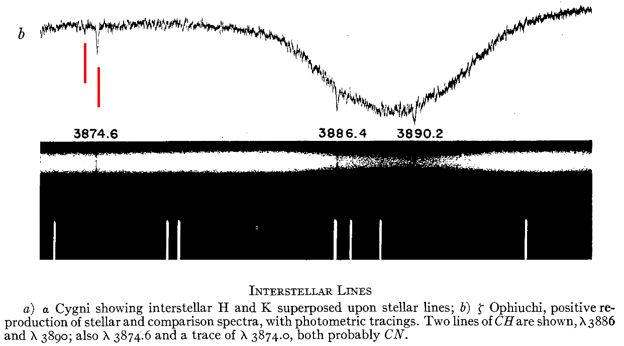 In this paper, Adams notes that he has detected Cyanide (CN) in space. The data is a bit complicated, but just for flavor, here is one of the plots from the paper: