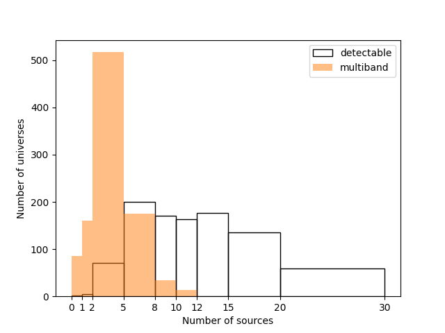 Median number of multiband sources (SNR > 8 and Tc < 50) in all catalog universes.