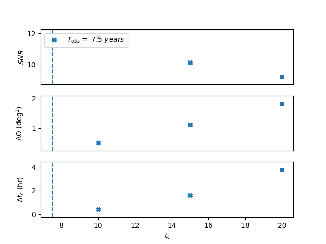 Localization OK if sky error < 10 sq.deg. for 7.5 years of observation and (time to merger) tc = 10 years