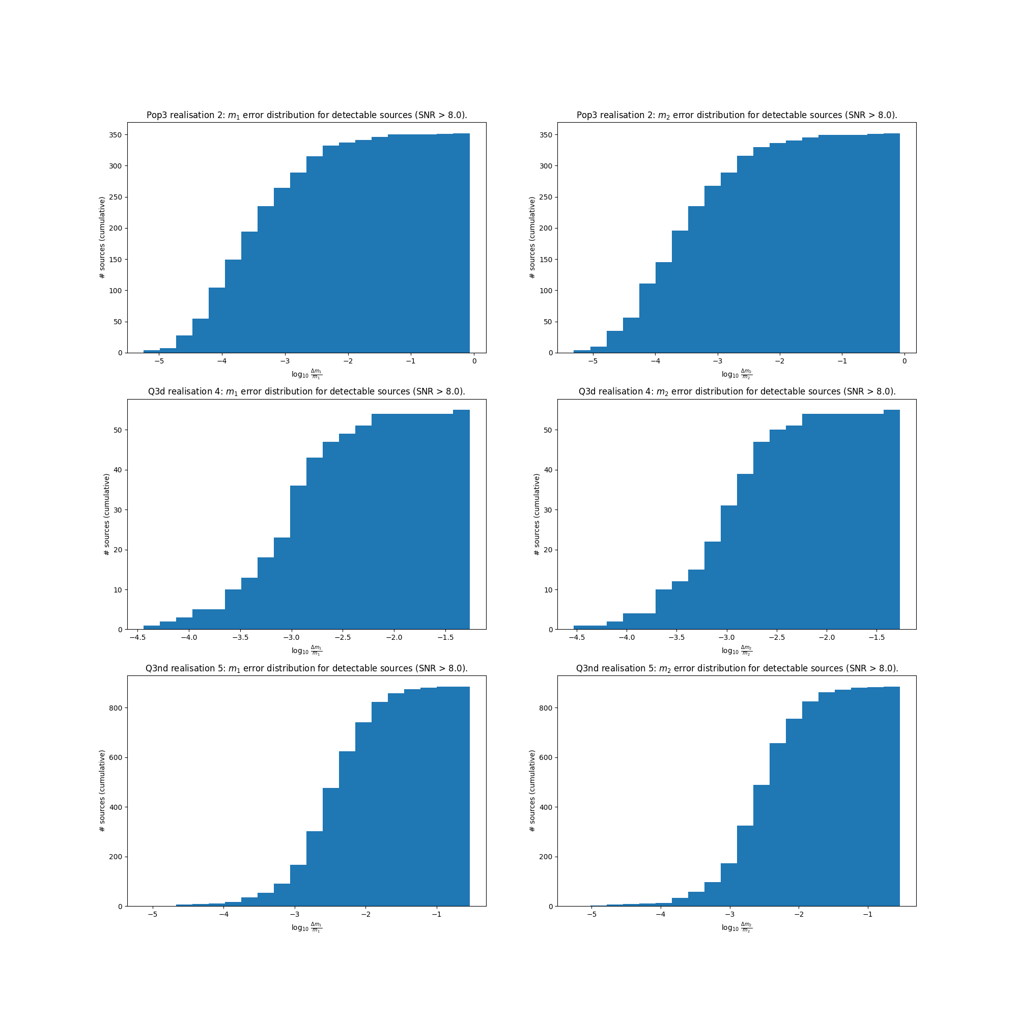 We took a catalog of MBHB events (for the populations Pop3, Q3d, Q3nd) and, for each population, build 10 realisations for a mission duration of 7.5 years. We then computed the SNR and the errors in parameter estimation for each realisation source, and, counted the number of detectable SNR > 8.0 sources and, among these, the number of sources with \(dm_1 / m_1\) < 0.3 and \(dm_2 / m_2\) < 0.5. For each population we selected the realisation with the best, the worst and the median number of such sources. The table is reported below.