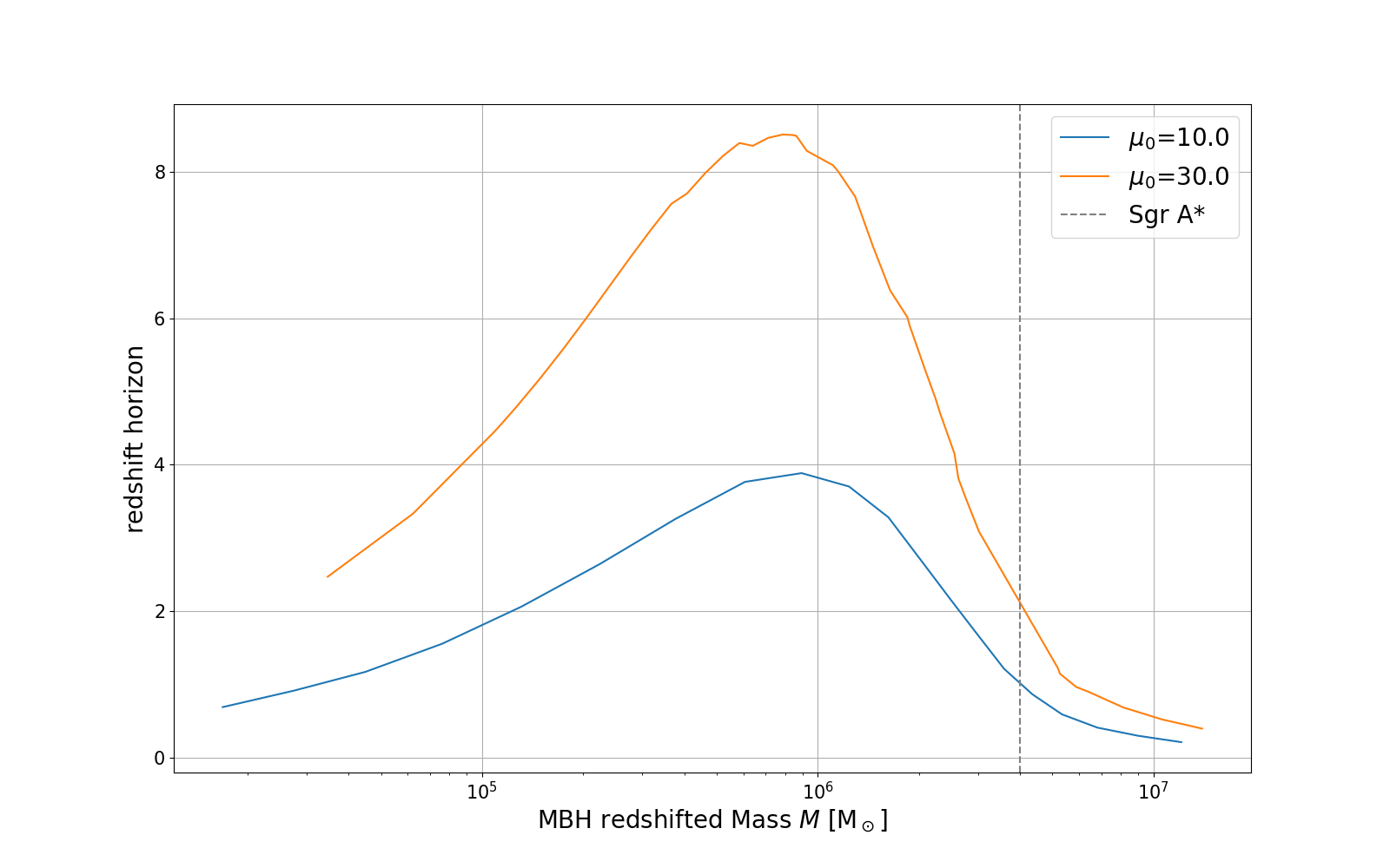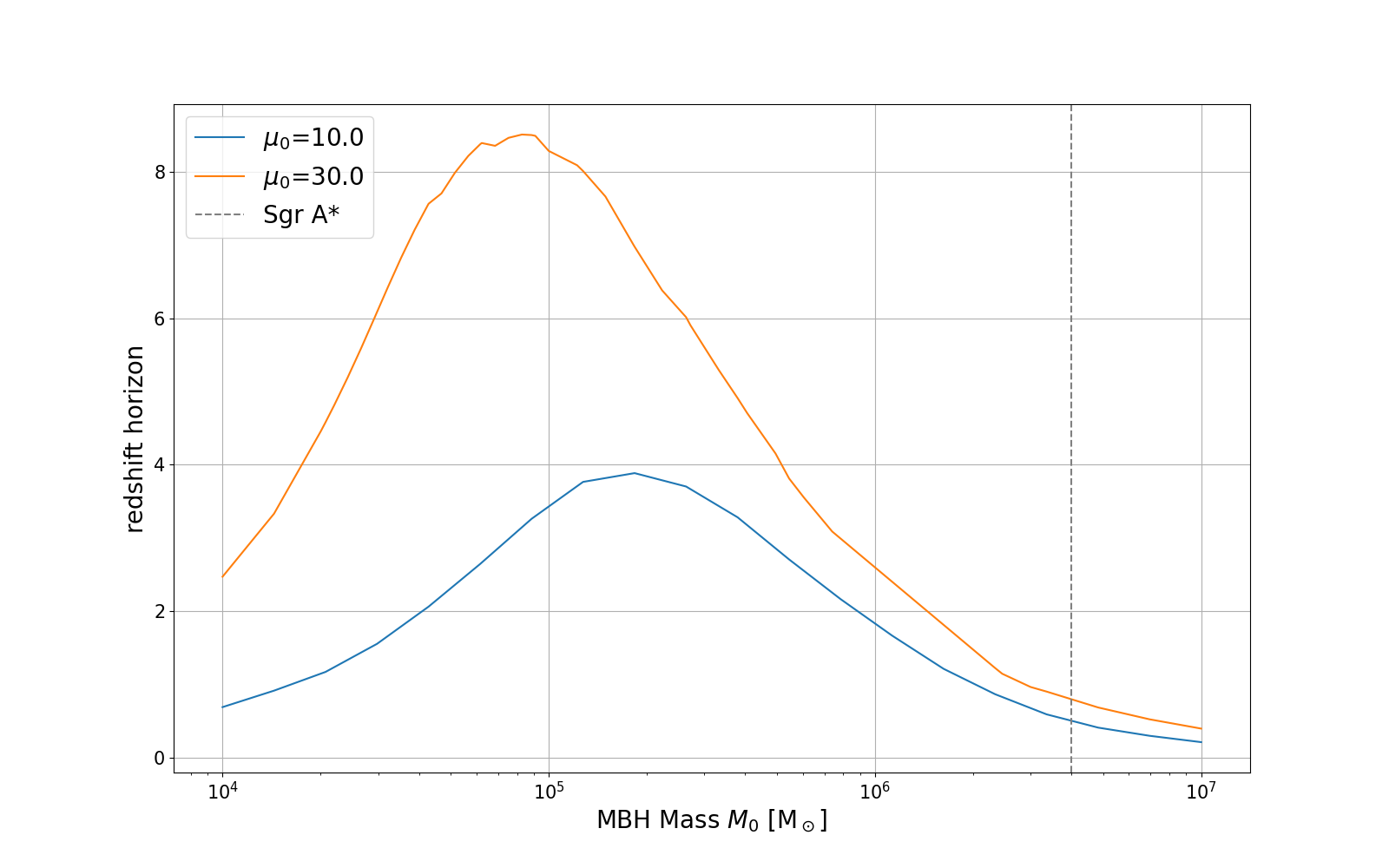 For different values of the EMRI system mu_0 mass we fixed one value of the system M_0 mass (see table) and generated 400 sources randomizing over the sky position at z=1.0. From this set of sources we selected the sky parameters maximising SNR for each value of mu_0. We then considered multiple M_0 values for each mu_0 and, fixing the sky parameters to the selected optimal values, we computed the z corresponding to SNR=20.0 (rescaled by the duty cycle).