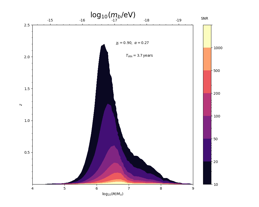 Compute the range of detectable (\(SNR>10\)) boson masses for a reference BH with initial mass \(M=4 * 10^6 M_{\odot}\) (i.e. SgrA\(^*\)-like) and spin \(a/M = 0.9\) at \(z=0.5\)}