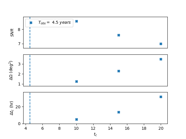 Localization OK if sky error < 10 sq.deg. for 4.5 years of observation and (time to merger) tc = 10 years