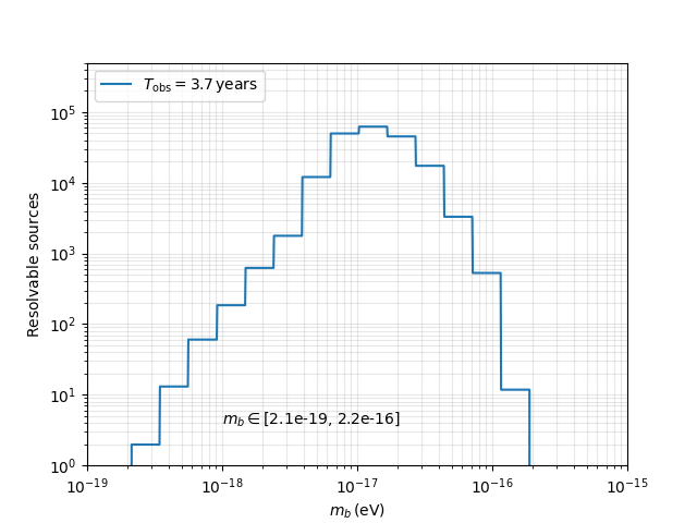 Expected number of resolvable sources with SNR > 10.0 as a function of boson mass.