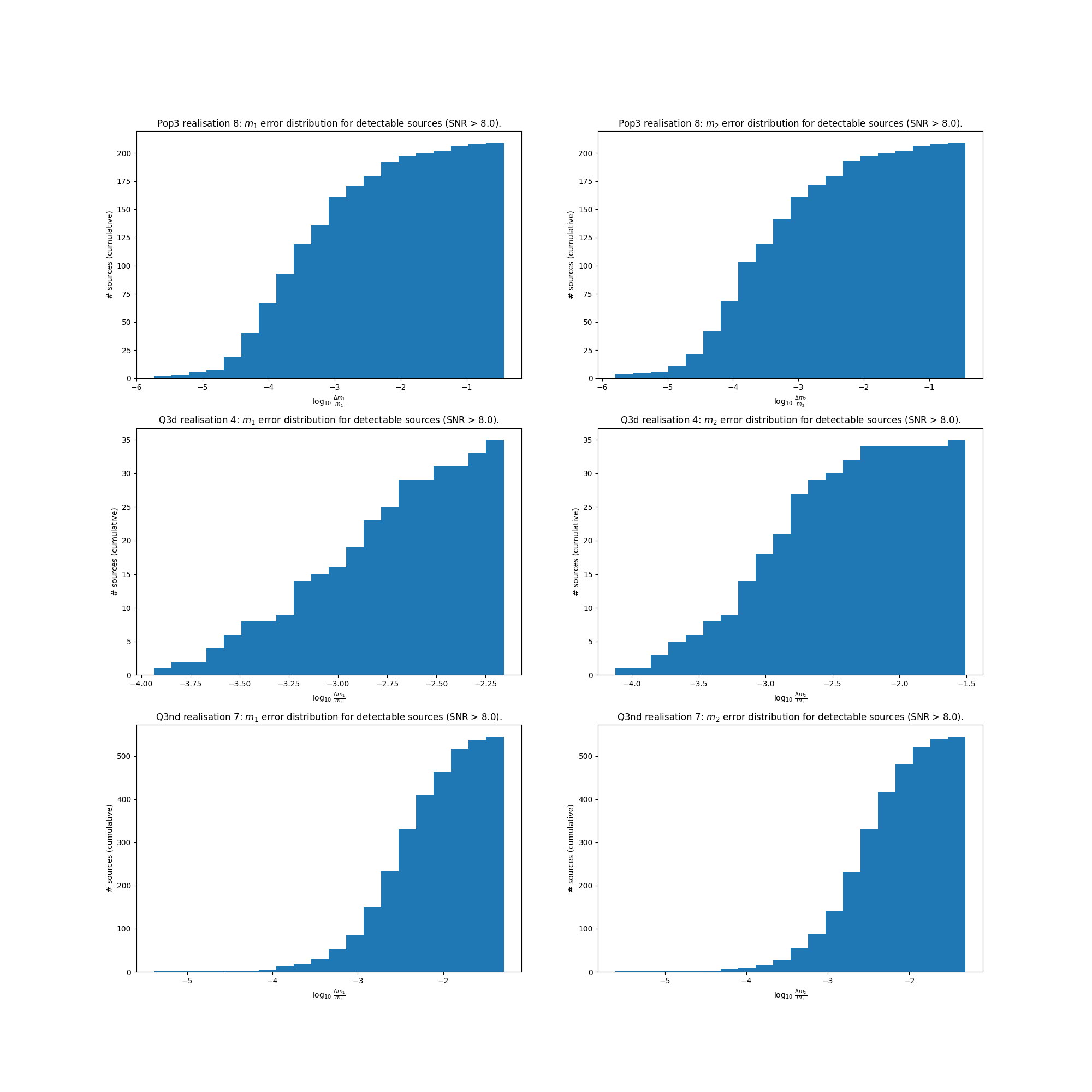 We took a catalog of MBHB events (for the populations Pop3, Q3d, Q3nd) and, for each population, build 10 realisations for a mission duration of 4.5 years. We then computed the SNR and the errors in parameter estimation for each realisation source, and, counted the number of detectable SNR > 8.0 sources and, among these, the number of sources with \(dm_1 / m_1\) < 0.3 and \(dm_2 / m_2\) < 0.5. For each population we selected the realisation with the best, the worst and the median number of such sources. The table is reported below.